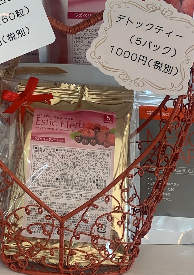 「プロ仕様」として研究・開発されたハーブティー エステサロン・SPA・美容院など、サロンやSPAの施術効率をサポートする目的で開発されたデトックティー・プロ「エスティックハーブ」。排泄の悩み対策に56種におよぶ美容系ハーブ素材をベースに、オリジナルのレシピを考案。その秘伝レシピを元に、一切の妥協を排除して、高度な独自製法で開発した、プロユースの高品質ブレンドハーブティーです。 リピーター続出!!美味しさにこだわったハーブティー パッケージを開けたとたんに広がる優雅な甘い香りと芳醇な味が自慢です。 今までハーブティーが苦手だった方に「おいしい」と喜ばれ、お飲みいただいています。このように、自然の植物で解決し、おいしさと飲みやすさも兼ね備えていることから、業界でも話題を集めています。 内容量: 120g(4g×30包) 原材料名:キャンドルブッシュ(輸入)、紅茶、難消化性デキストリン、ローズヒップ、ルイボス、夕顔果実末、コラーゲンペプチド(魚由来)、有機ゲルマニウム、オニオンエキスパウダー、赤しそパウダー、紫芋、マスタードパウダー、粉わさび、パプリカ、ターメリック、バジル、ローリエ、マジョラム、オレガノ、パセリ、セージ、サボリ、タイム、ペパーミント、赤唐辛子、青唐辛子、コリアンダー、カルダモン、モロヘイヤ、ギムネマ、イチョウ葉、ドクダミ、杜仲葉、ケール、スギナ、よもぎ、柚子、セロリ、山芋パウダー、さくら葉、ガーリック、ショウガ、みかんの皮、メース、クミン、オールスパイス、ディル、スターアニス、シナモン、フェンネル、山椒、クローブ、ナツメッグ、ホワイトペッパー、ブラックペッパー/香料、(一部にやまいもを含む)